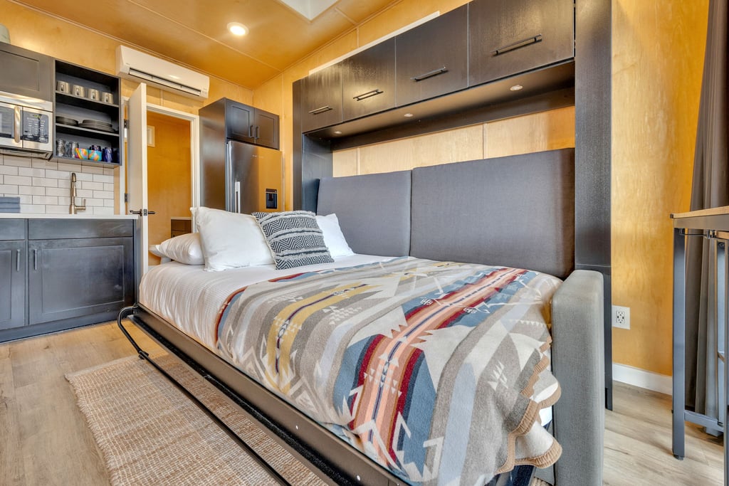 These spacious open-concept units feature a couch and a queen-sized Murphy bed with a plush mattress, high-end linens, and wool Pendleton blankets for those crisp, high desert nights under the stars- experience off-the-grid stargazing from your bed with a 4X4 skylight or from your hot tub in a private yard.