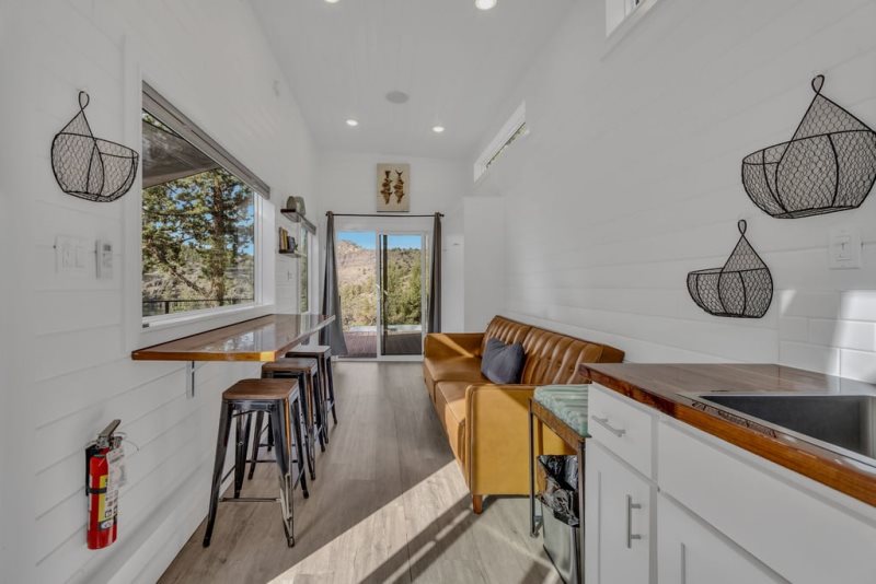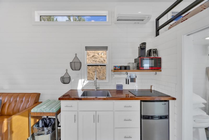 Experience our exclusive lodging, and stay in one of our luxury tiny homes! This spacious, 200-square-foot open-concept unit features a full-sized Murphy bed with comfortable sleeping for two and a 69-square-foot loft with a king-sized bed. Both mattresses are 100% organic latex and covered with high-end linens, pillows, and wool. Pendleton blankets for those crisp, high desert nights under the stars. There is also a full-sized futon for extra guests featuring linens upon request.