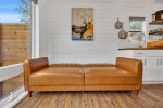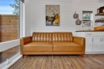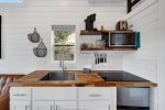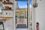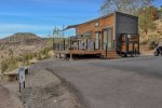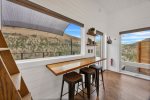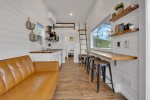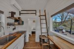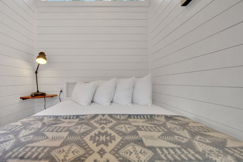 Experience our exclusive lodging and stay in one of our luxury tiny homes! This spacious, 200-square-foot unit features a queen-sized bed with comfortable sleeping for two in a private bedroom and a loft with a twin-sized bed. Both mattresses are made of 100% organic latex and covered with high-end linens, pillows, and wool Pendleton blankets for those crisp, high desert nights in the stars. There is also a full-sized futon for extra guests featuring linens upon request.