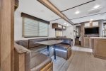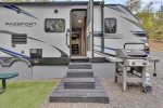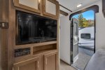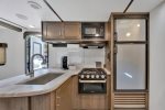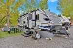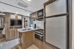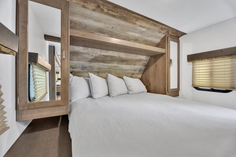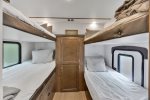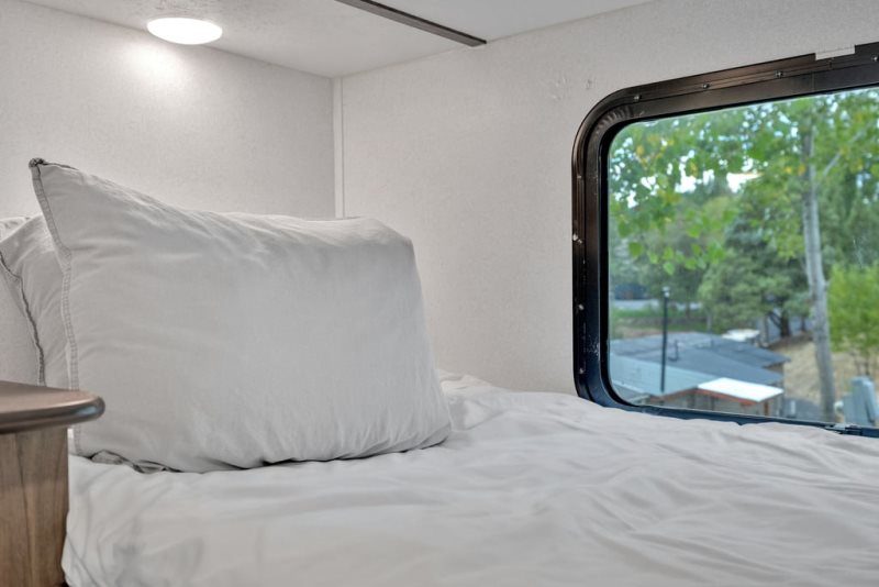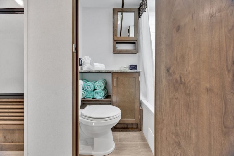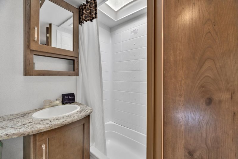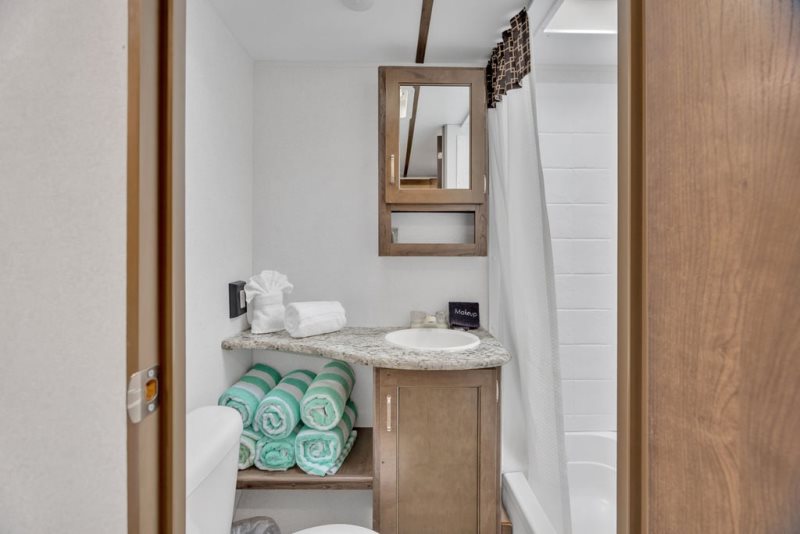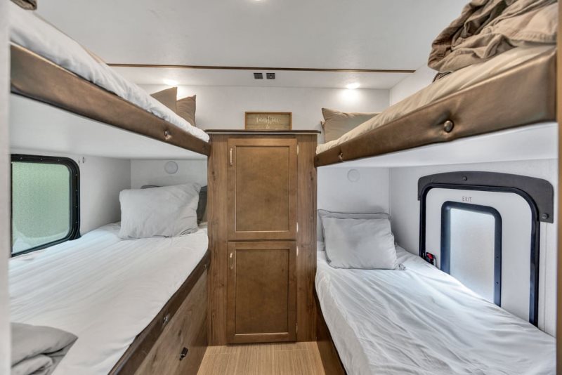 Pack your bag and jump in the car. This RV Rental is ready for you to stay. This beautiful, fully equipped RV has everything you need for a getaway to the lake. This gorgeous wood-trimmed unit has open space for all to enjoy. The main bedroom has a queen-sized bed with plenty of storage. This unit also has a spot for the family with four twin-sized bunk beds. You also have a full-sized sofa sleeper in the living room and a full bathroom with a shower if needed. The kitchen comes equipped with all the essential cooking needs for easy meals.